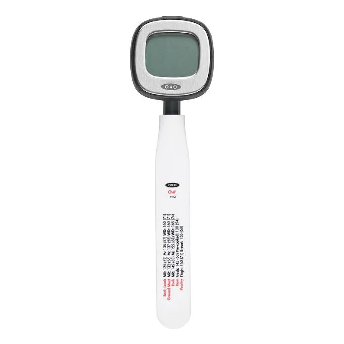 I love this oxo good grips instant read digital thermometer! It has a pivoting head for easy read and a ultra thin tip for a quick temperature read. It has a cover with a usda temperature chart on it. The numbers are a large size so it is easy to read. This is a very simple to use device. All you do...